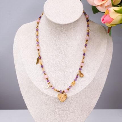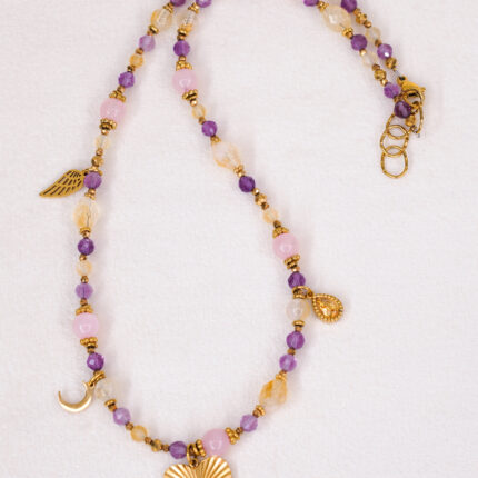 Naszyjnik z 4mm ametystów, cytrynów, złotych hematytów oraz elementów ze stali nierdzewnej.