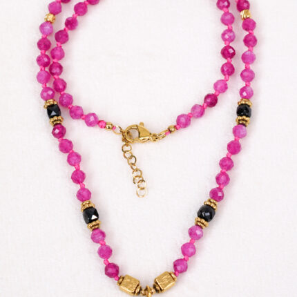 Naszyjnik z 4mm różowych jadeitów, czarnych turmalinów, złotych hematytów oraz elementów ze stali nierdzewnej.