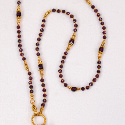 Naszyjnik z 3mm granatów, złotych hematytów oraz elementów ze stali nierdzewnej.
