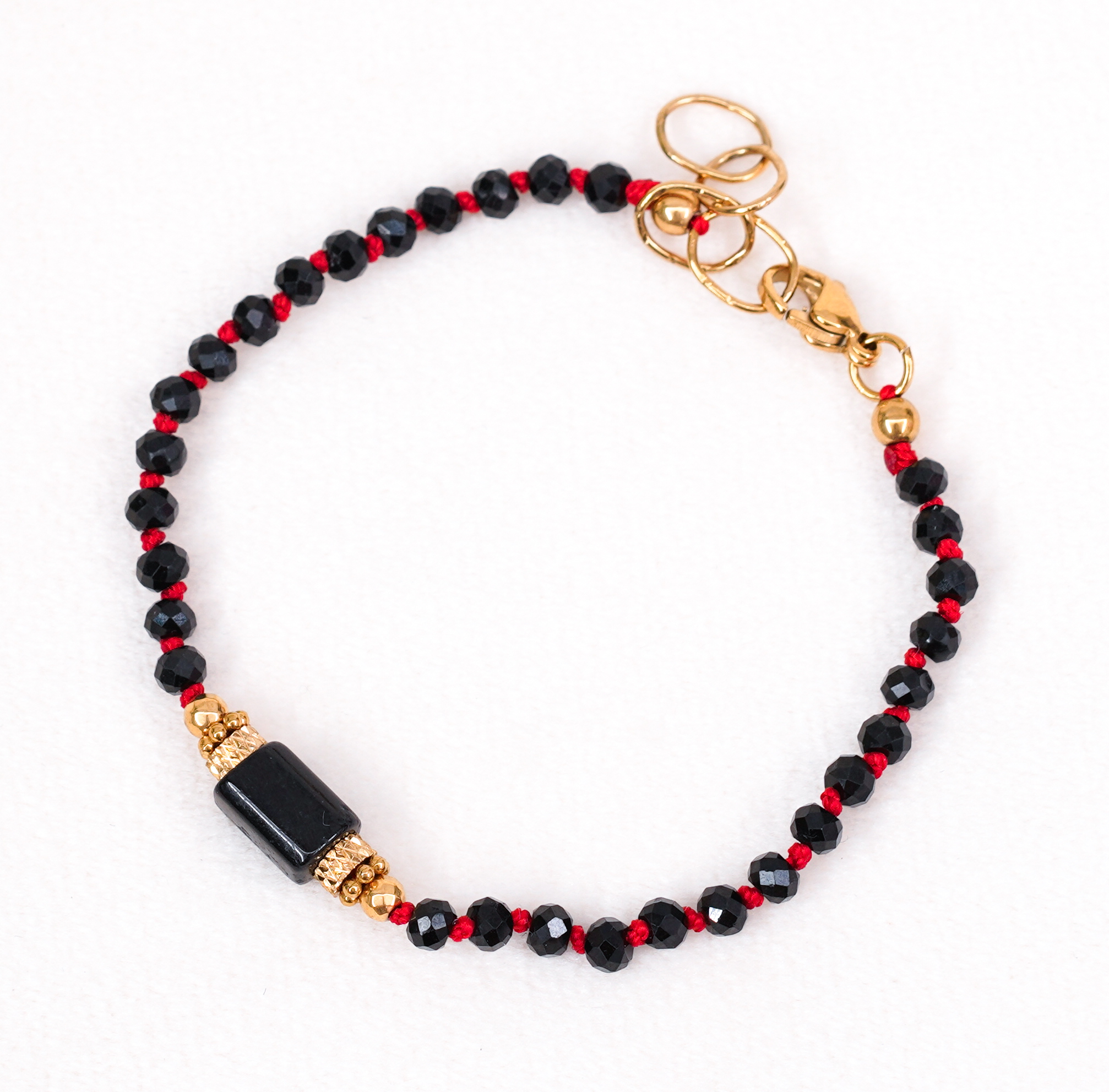 Bransoletka ochronna wykonana z naturalnych czarnych turmalinów, starannie supełkowana na czerwonej nici. Każdy supełek wzmacnia intencję ochrony, a czarny turmalin uznawany jest za jeden z najsilniejszych kamieni chroniących przed negatywną energią, złym spojrzeniem i niekorzystnymi wpływami. Czerwona nić symbolizuje ochronę, siłę i odcięcie złych energii, tworząc z turmalinem potężny talizman noszony blisko ciała. Delikatna, a jednocześnie pełna mocy – idealna jako osobisty amulet na co dzień.