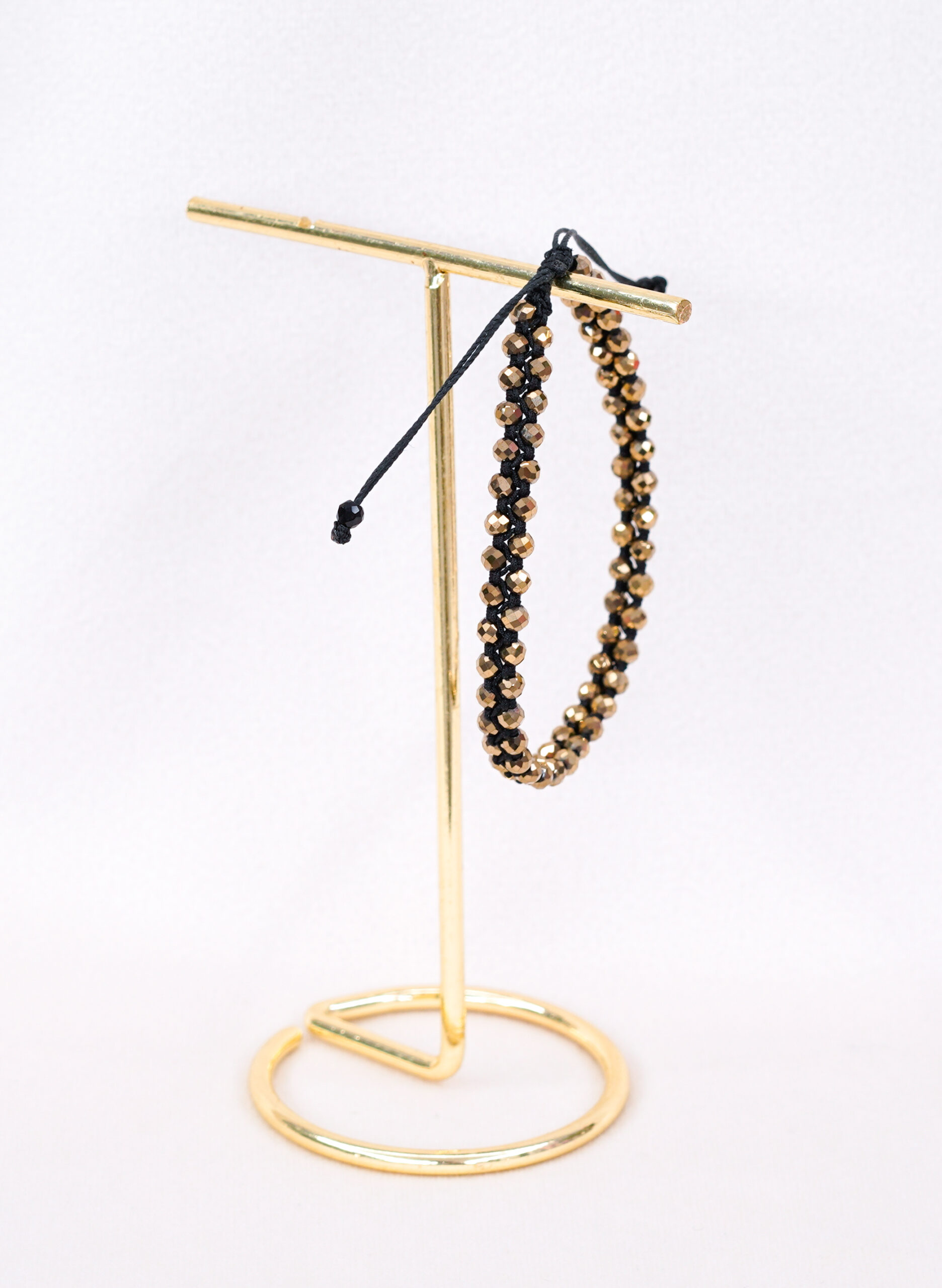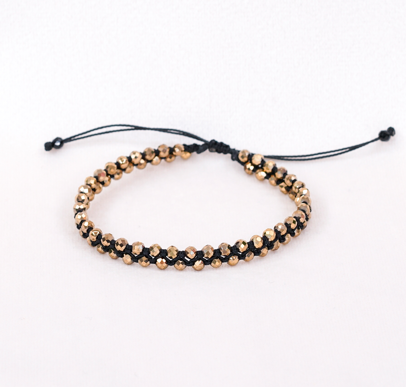 Bransoletka pleciona z 3 mm hematytów w kolorze ciemnego złota czarną nitką