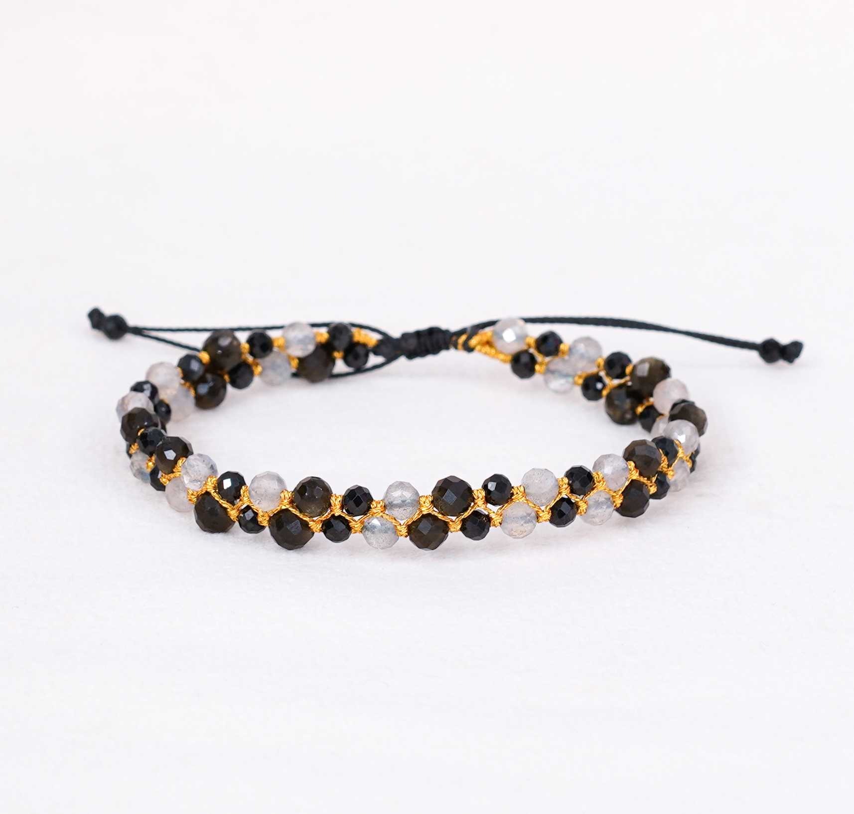 Bransoletka z 3-4 mm czarnych turmalinów, labradorytów i złotych obsydianów.