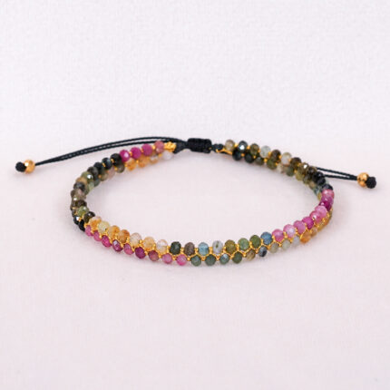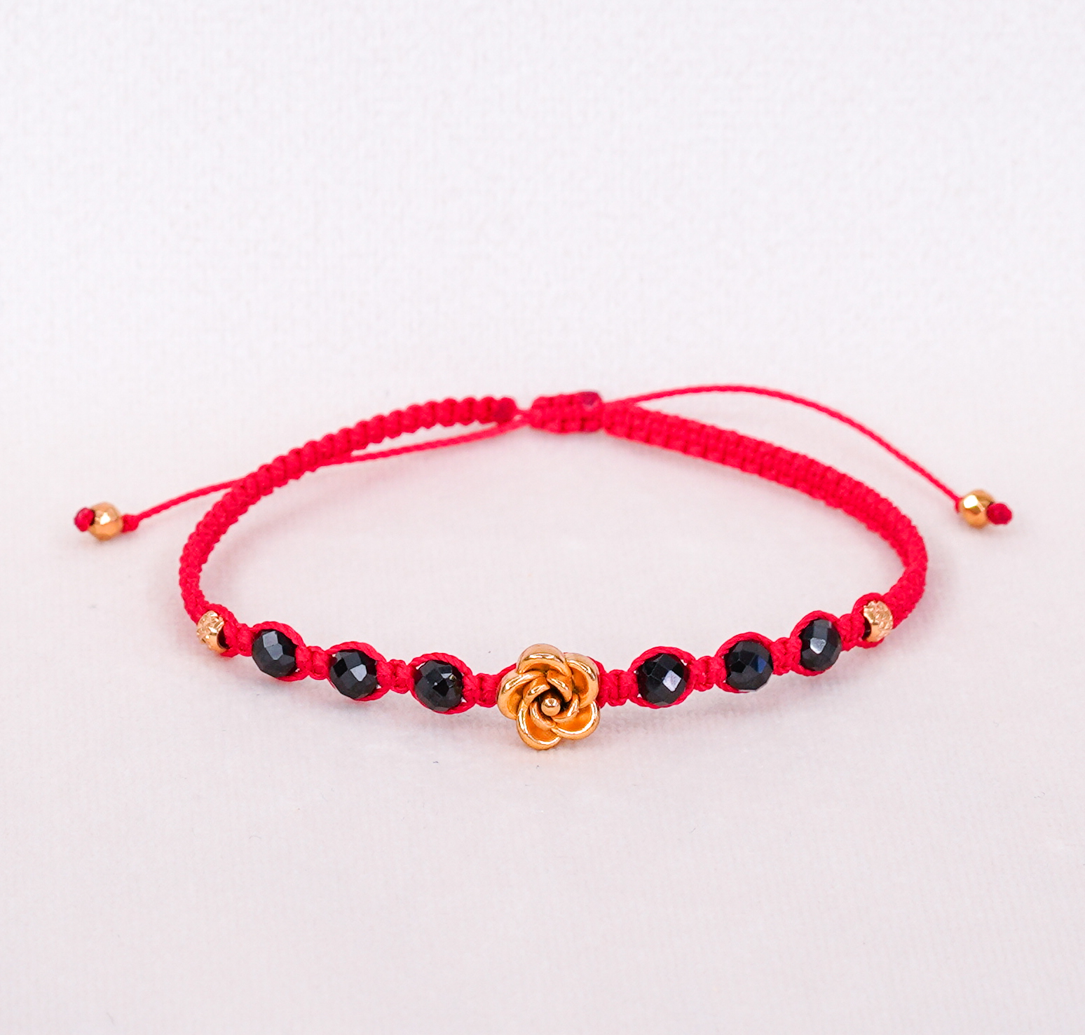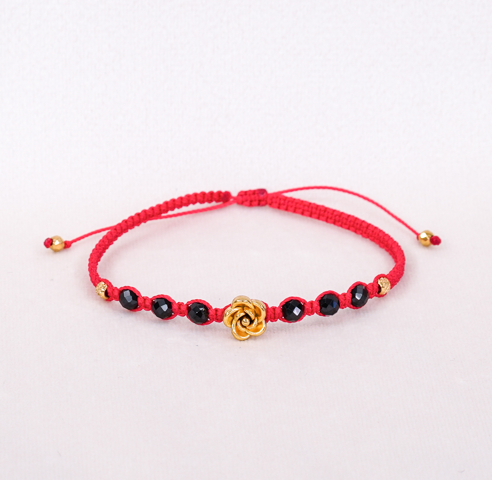 Subtelna, a jednocześnie pełna energii — ta ręcznie pleciona bransoletka łączy w sobie moc czarnego turmalinu z symboliką czerwonej nici i złotej róży. Fasetowane turmaliny dodają blasku i wspierają ochronę przed negatywną energią, a złoty kwiat w centrum podkreśla kobiecość, delikatność i wewnętrzną siłę.