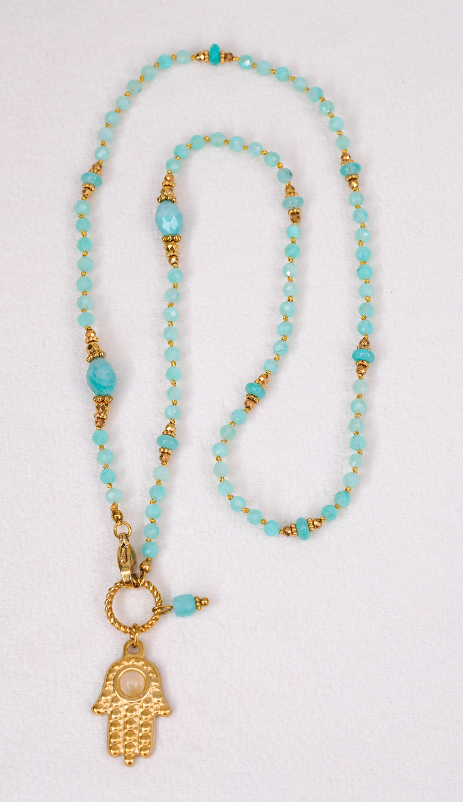 Naszyjnik z 3mm amazonitów, złotych hematytów oraz elementów ze stali nierdzewnej.
