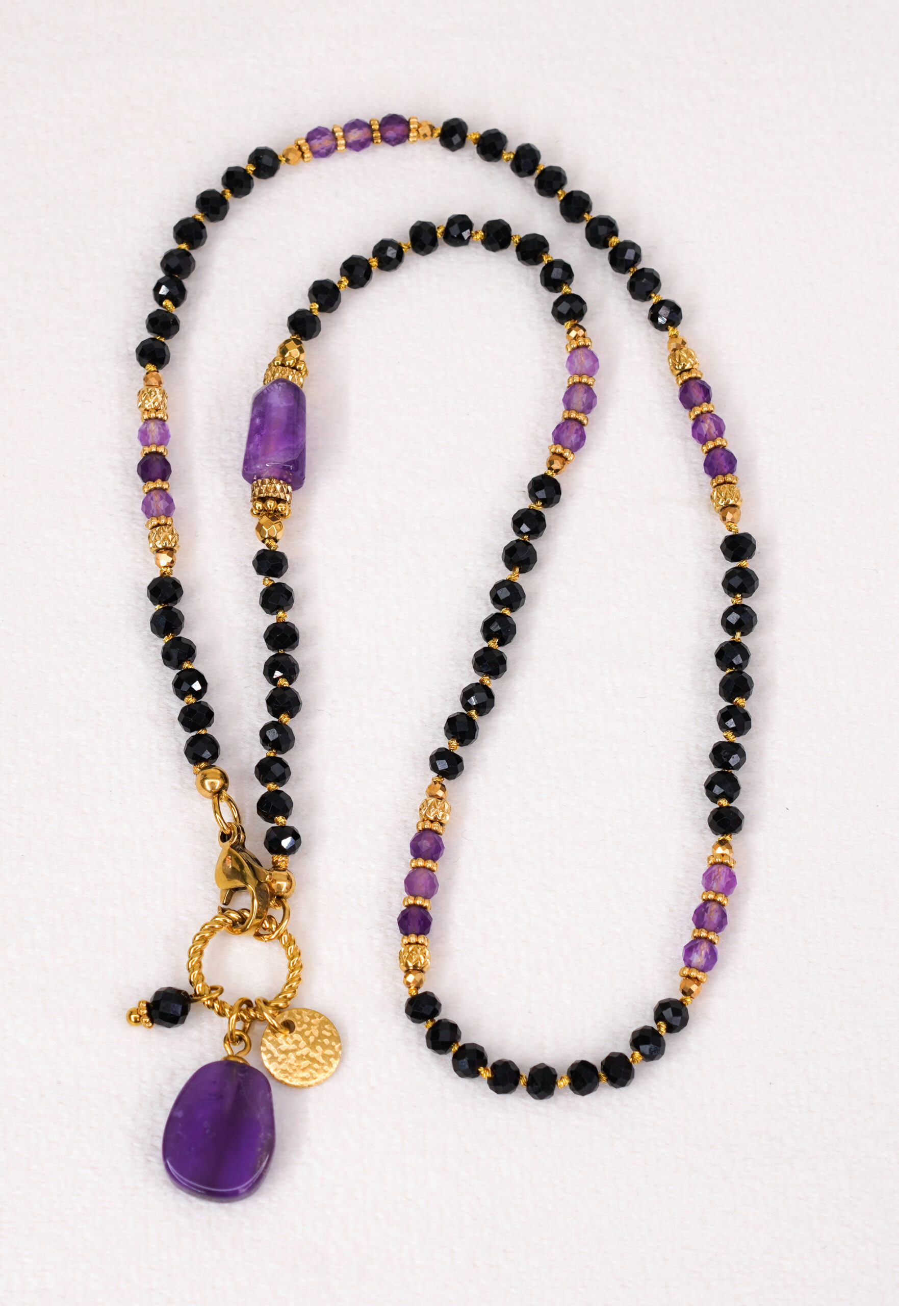 Naszyjnik supełkowany z czarnych turmalinów i ametystów to wyjątkowa biżuteria łącząca ochronę z duchową harmonią.