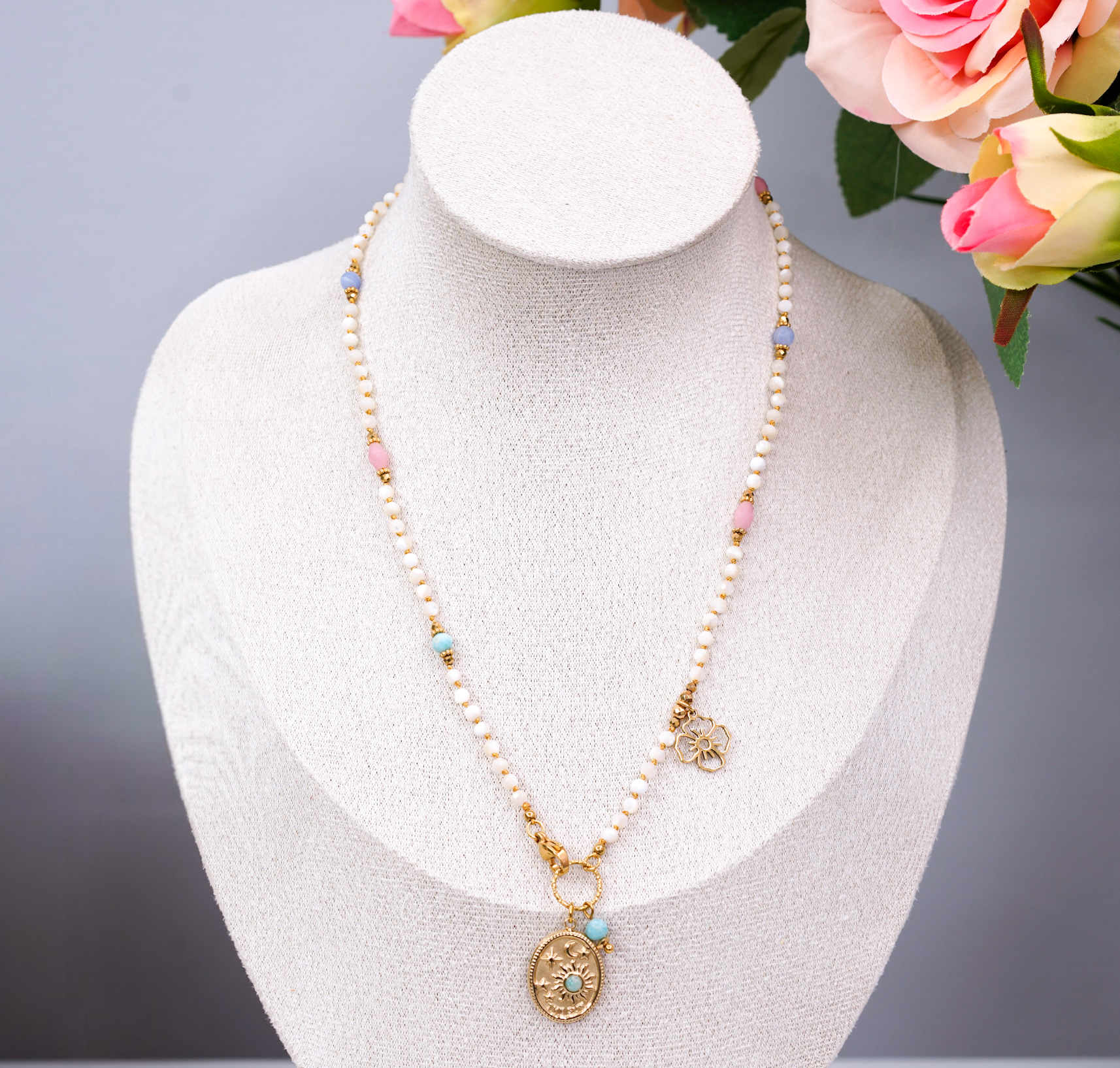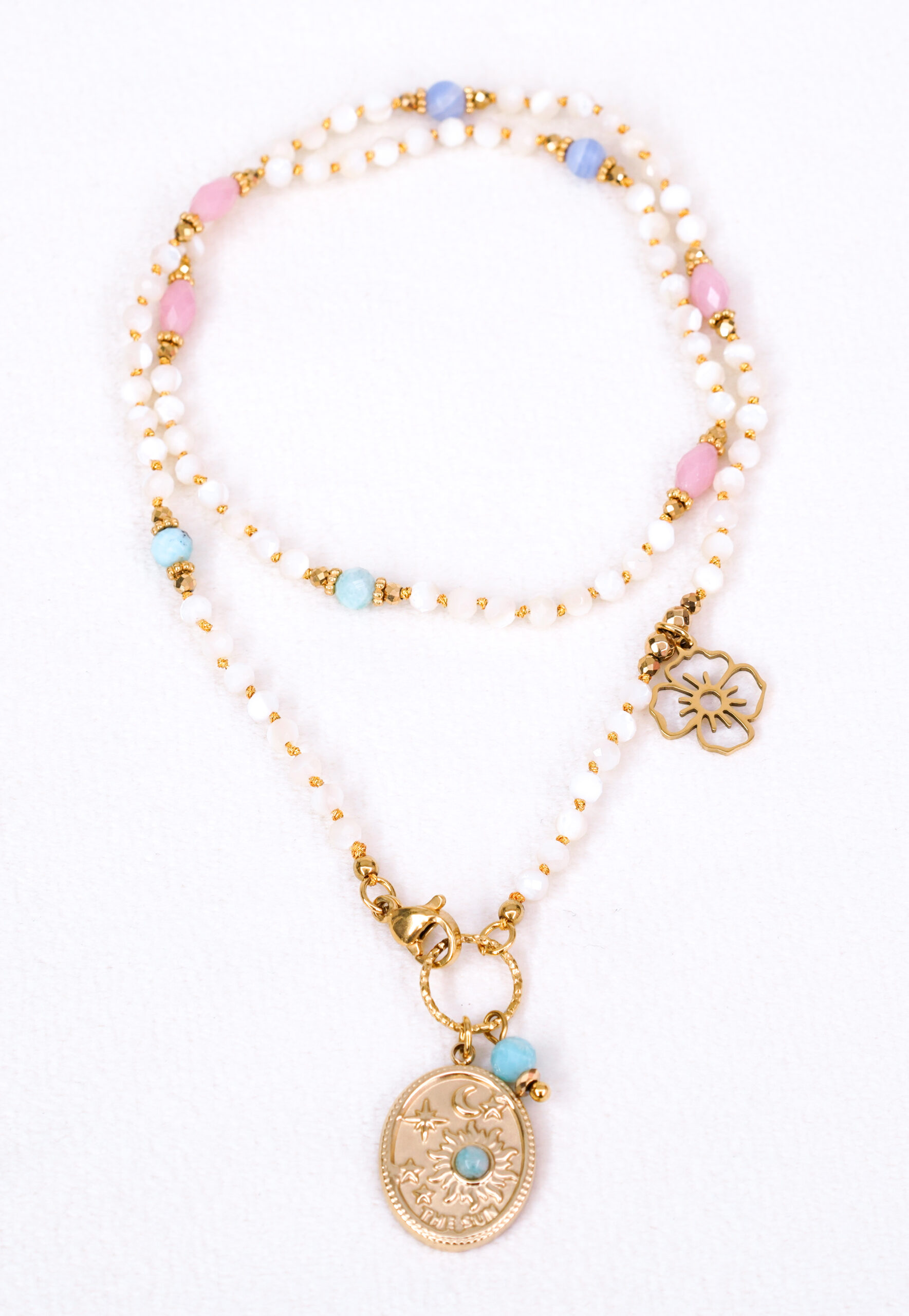 Naszyjnik emanuje spokojem, kobiecością i naturalnym urokiem. Pastelowe kamienie dodają mu radosnego, lekkiego charakteru, przywołując skojarzenia z latem, słońcem i morską bryzą.
