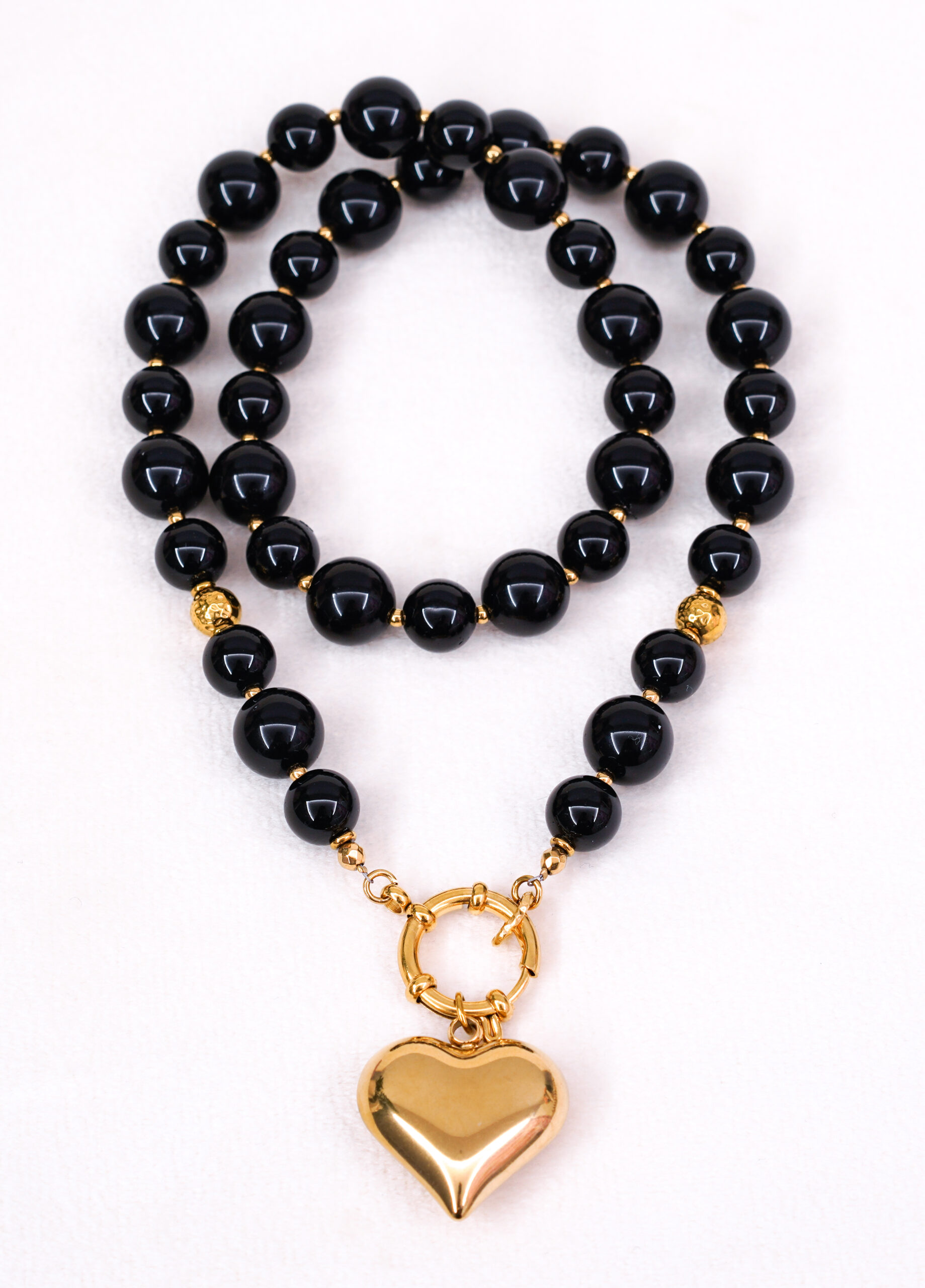 Centralnym akcentem naszyjnika jest złota zawieszka w kształcie serca, symbol miłości, bliskości i emocjonalnej równowagi. Kontrast pomiędzy intensywną czernią onyksów a ciepłym, złotym blaskiem serca tworzy wyjątkową, przyciągającą uwagę kompozycję.