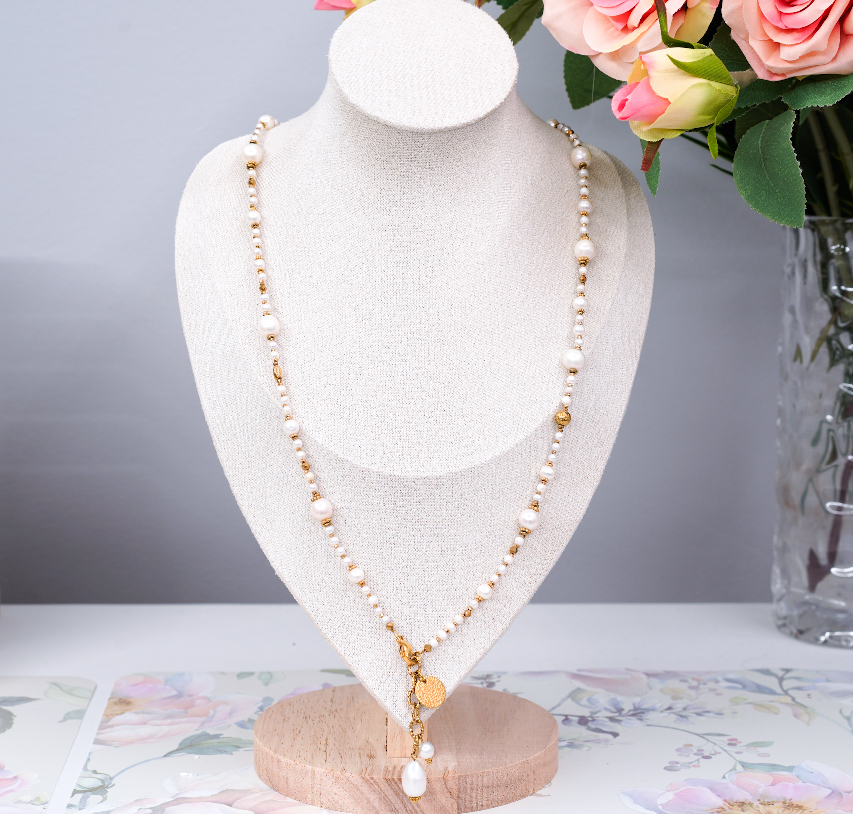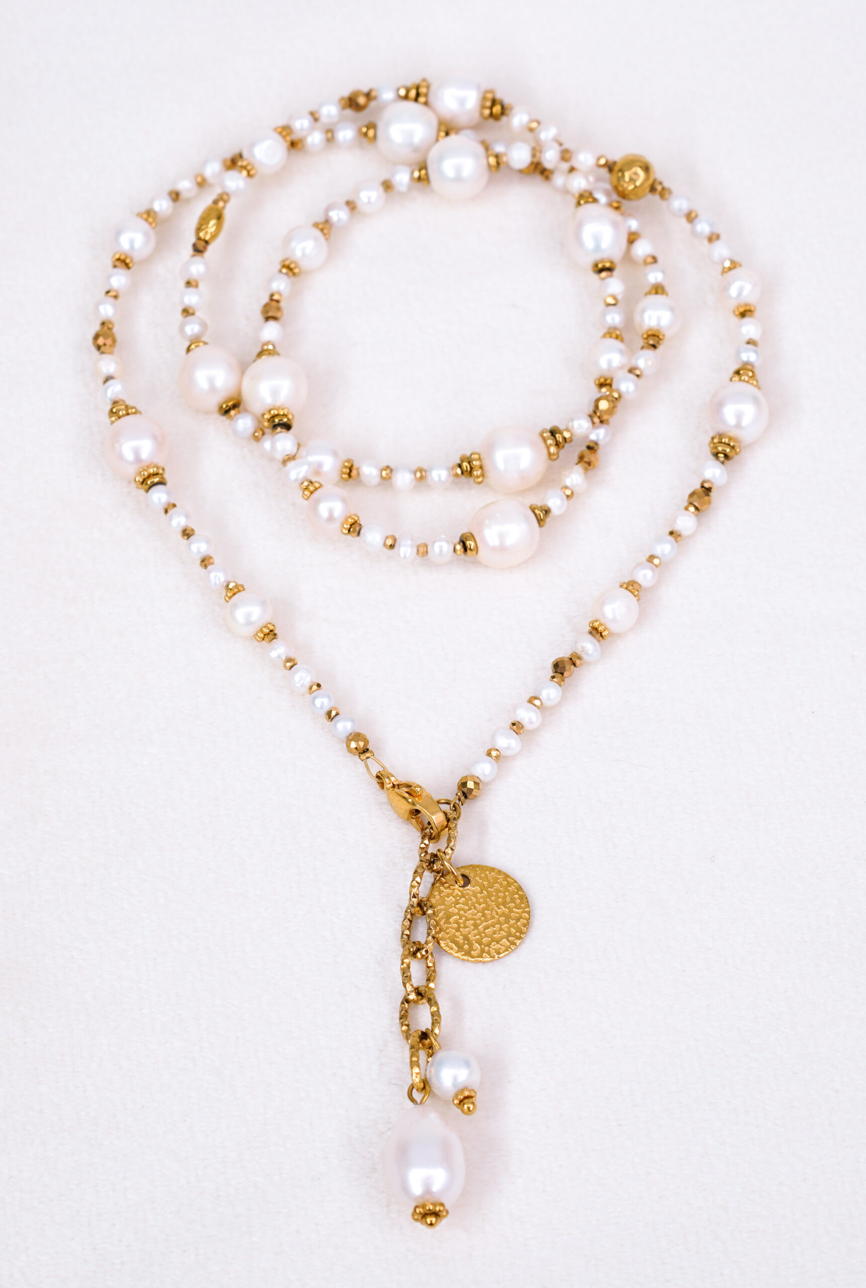 Naszyjnik z naturalnych pereł 3-8mm, złotych hematytów oraz elementów ze stali nierdzewnej.