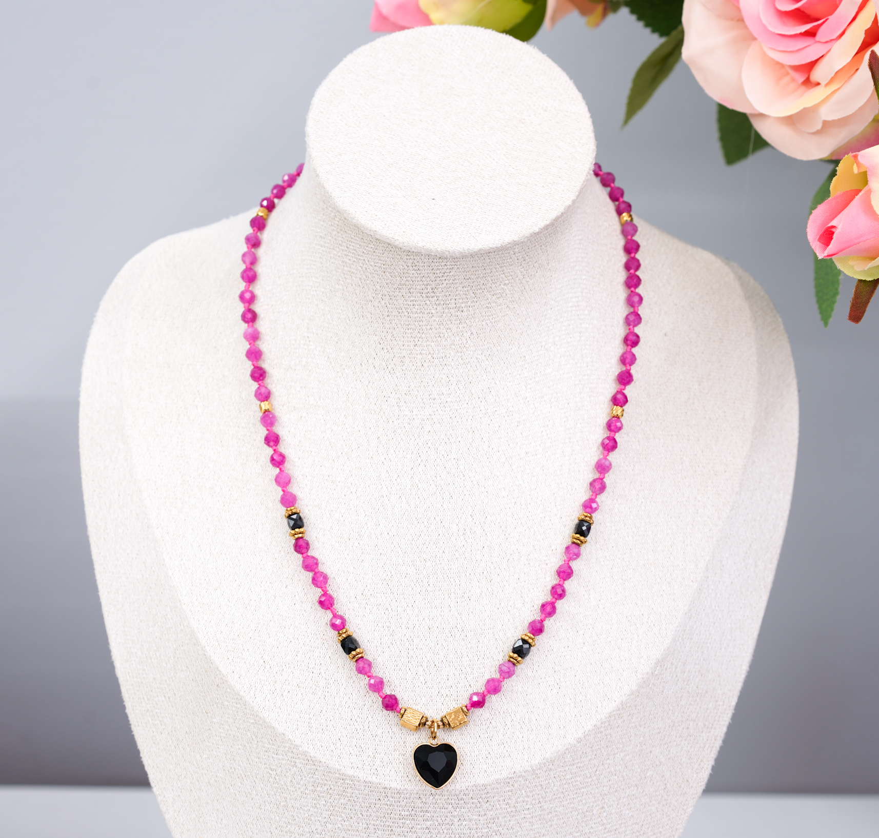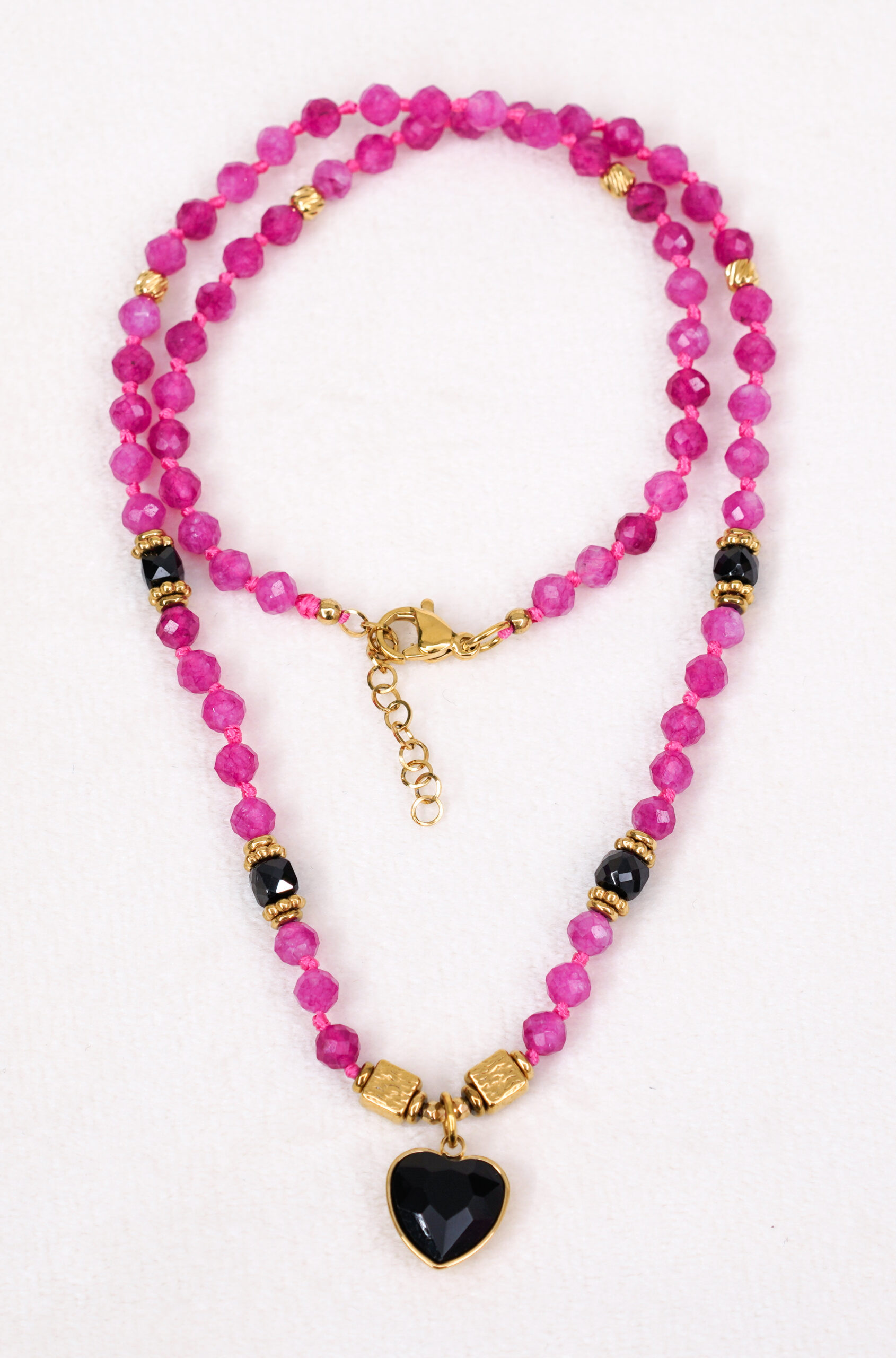 Czarne serce – wyrazisty akcent symbolizujący siłę uczuć, głębię emocji i ochronę. Kontrast pomiędzy subtelnym różem kamieni a intensywną czernią zawieszki nadaje biżuterii nowoczesny, a jednocześnie bardzo symboliczny charakter.