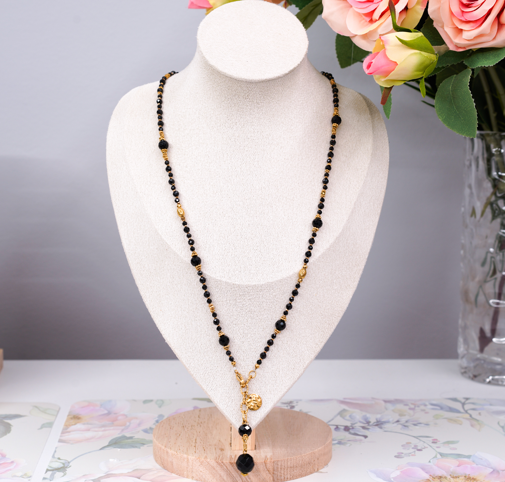 Pełen wyrazistej energii naszyjnik wykonany z naturalnych czarnych spineli i turmalinów. To połączenie kamieni o głębokiej, intensywnej barwie tworzy biżuterię o nowoczesnym, a zarazem ponadczasowym charakterze.