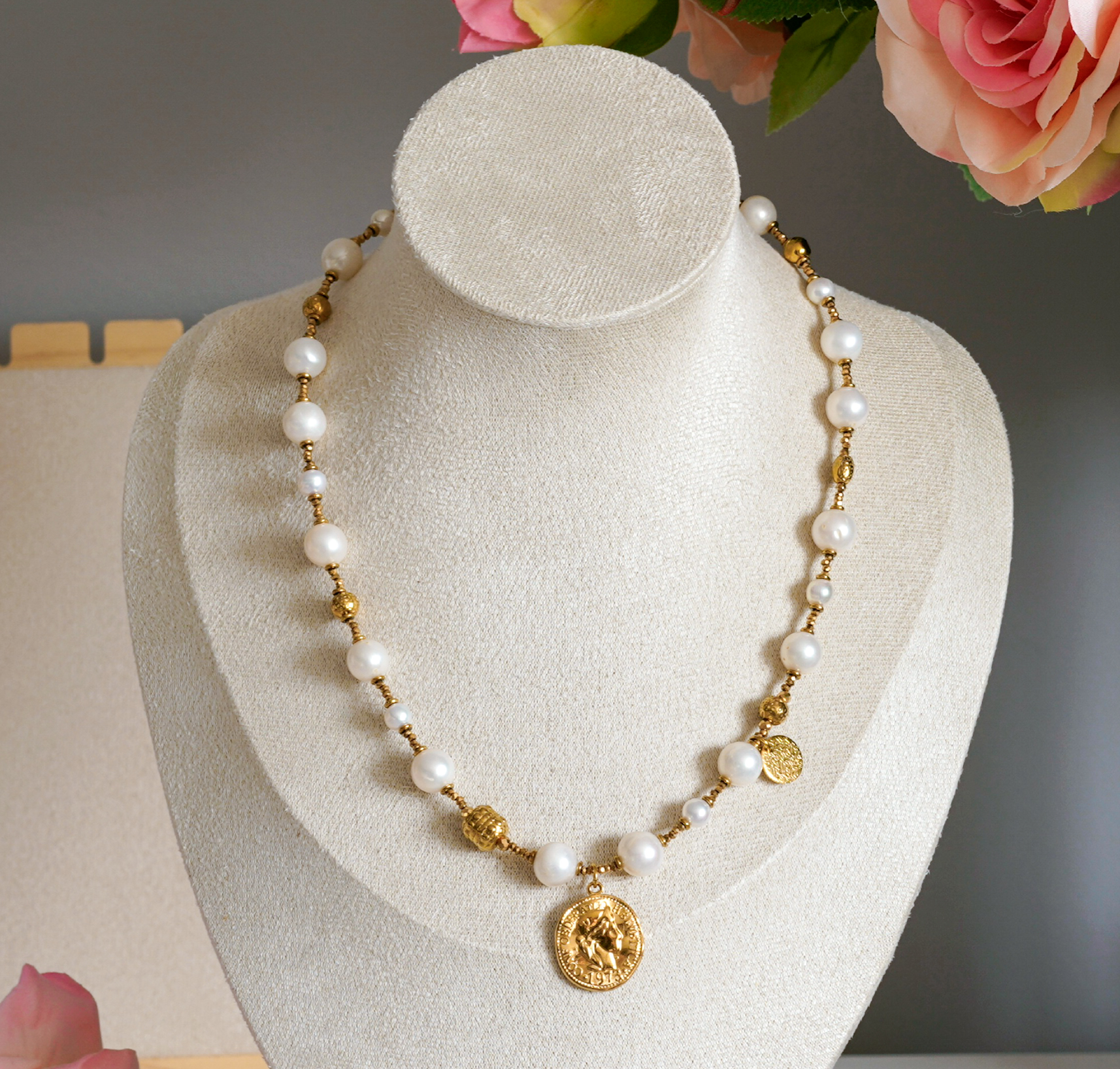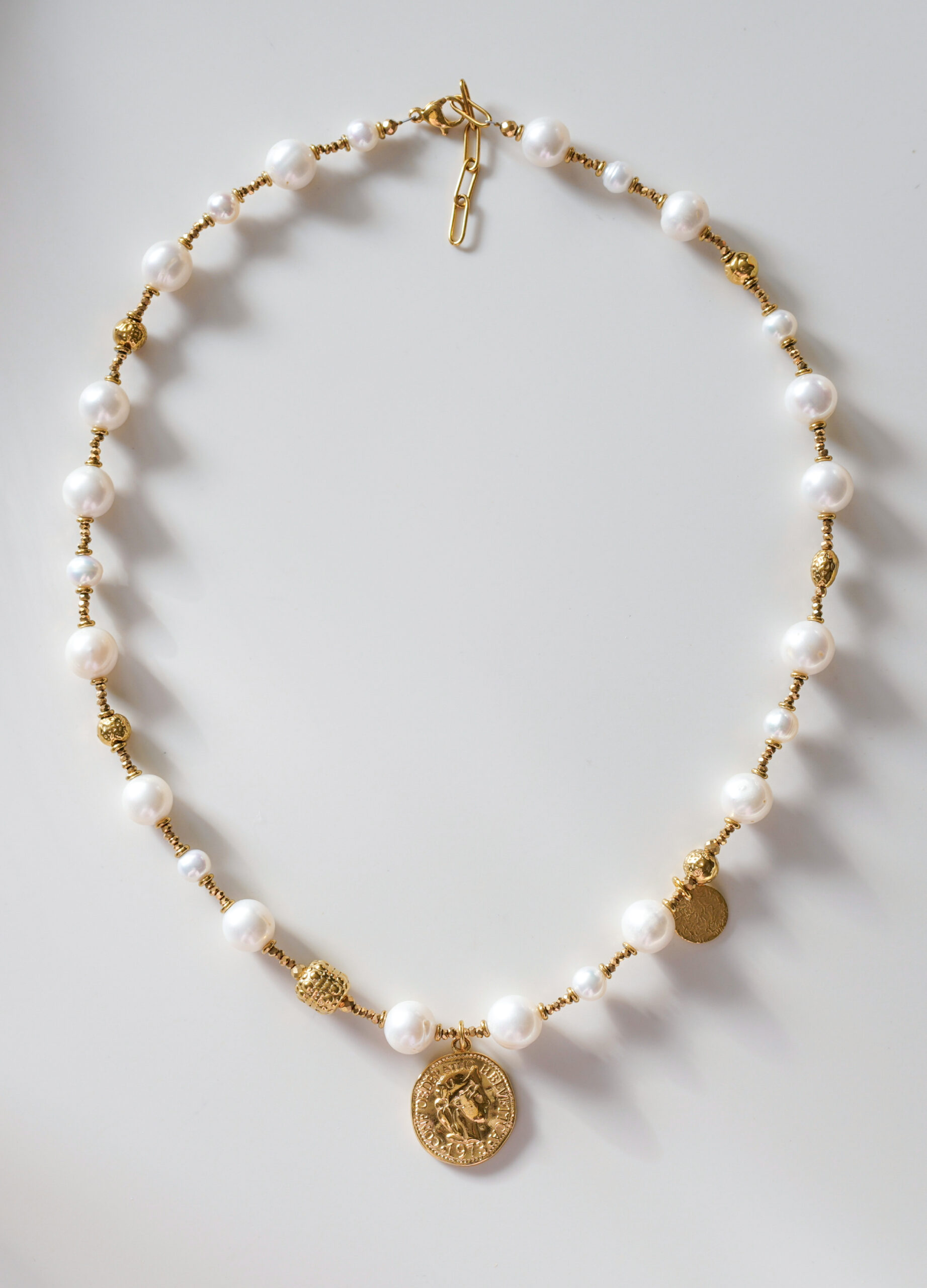 Delikatny, a jednocześnie wyrazisty naszyjnik wykonany z naturalnych pereł, przeplatanych złotymi akcentami. Klasyczne perły w połączeniu ze złotem tworzą ponadczasową biżuterię, która pięknie rozświetla dekolt i dodaje elegancji każdej stylizacji.