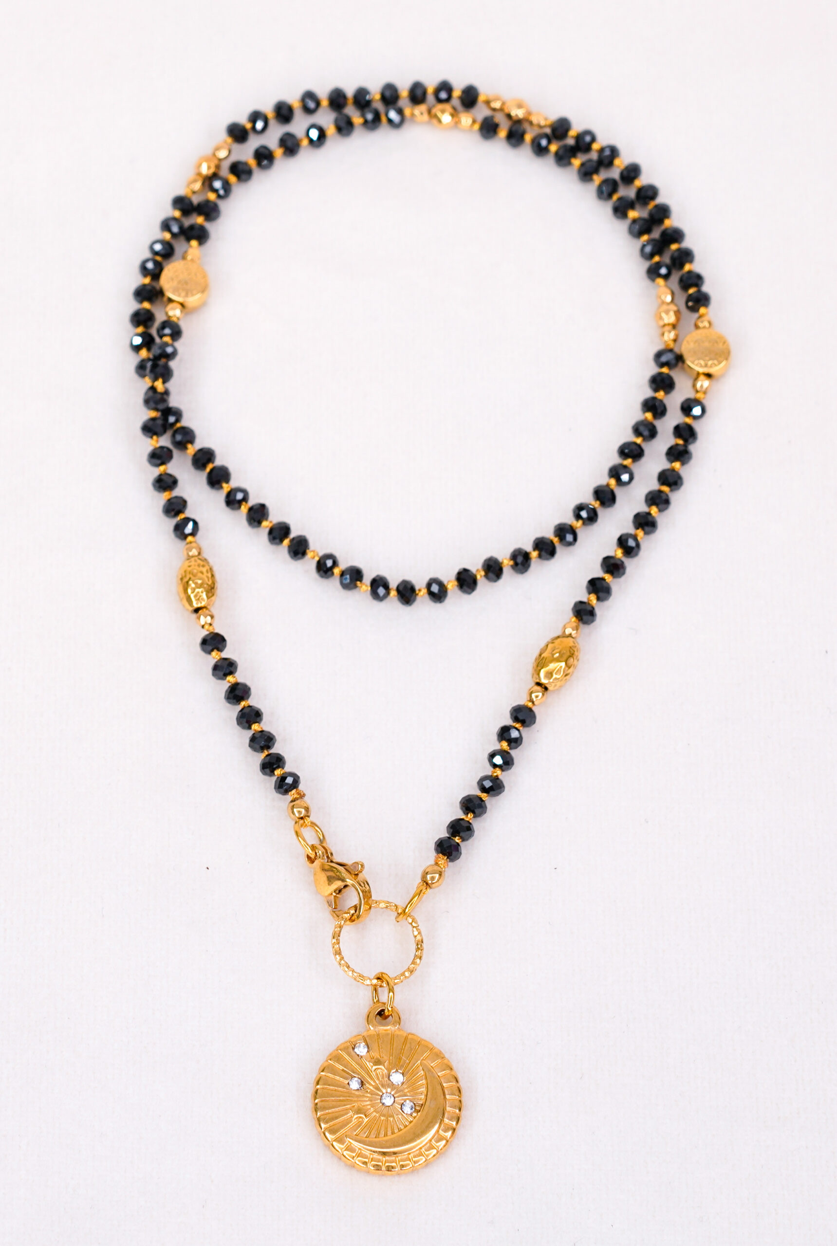 Wyjątkowy naszyjnik wykonany z drobnych, fasetowanych spineli o głębokiej, lustrzanej czerni. Każdy kamień został oddzielony ręcznie wiązanym supełkiem na złotej nici, dzięki czemu biżuteria jest trwalsza, bardziej elastyczna i pięknie układa się na dekolcie.